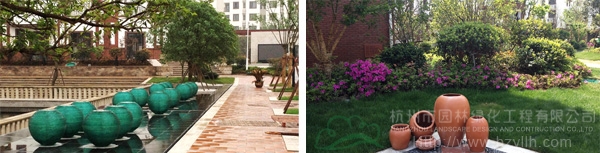 更值得一提的,還有隨處可見的草坪,隨著道路的延伸,草坪時而在不同的植物組團四周鋪展,時而與一棵棵高大的香樟、無患子為鄰,間或在小廣場的四周漫生一片綠意。大面積的草坪應用,使得小區就像坐落在一片綠色的地毯中,映著白墻紅瓦的建筑,更顯綠意濃濃。不經意見,更見幾只高低不一的紅陶瓷罐隨意散落在草坪里,在陽光的照耀下,泛出溫潤的光澤,一段靜謐的時光,仿佛就這樣凝固了。