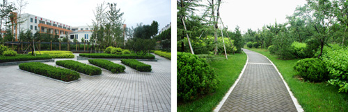 每個景觀節點上,植物的配置方法都是不一樣的,如在下沉廣場,主要是以小龍柏、金葉女貞等小灌木片植成方形或弧形,間或點綴石楠、梅樹,看起來規整、簡潔;而在設計風格為江南園林的南廣場上,是將貴重的造型油松單植,通過不同的組合,形成三個風格相近的綠島,周邊種植美人蕉、玉簪、竹子,并砌起白墻,上面開圓形拱門或圓窗,散發出詩意江南的靜謐和婉約氣息。“游憩步道是貫穿整個景觀的軸線,為了形成曲徑通幽的景觀效果,我們將對植、孤植、叢植都多種方法結合運用,特別是在三叉路口,多種植海棠、櫻花、杏花等,一方面,花開的時候,綠葉間繁花點點,會吸引人們不斷向前探尋更多的美景;而花落之后,茂密的枝葉又形成隱隱約約的視覺感受,前方轉過彎后風景什么樣,又讓人很想去看看。”高經理笑著說。
