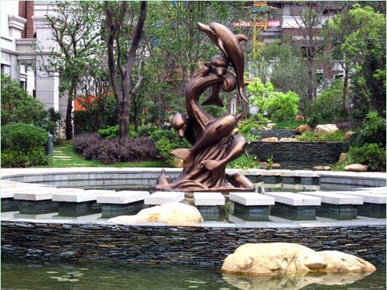 景觀小品是景觀中的點(diǎn)睛之筆,一些造型優(yōu)美的藝術(shù)小品,更是讓空間環(huán)境生動(dòng)起來(lái)的關(guān)鍵因素。在保利·拉菲,帶有濃郁意大利氣息以及中西文化合璧的景觀小品隨處可見(jiàn)。入口處的歐式水景幕墻利用中國(guó)黑、黃銹石燒面、砂巖雕花巧妙結(jié)合,形成一幅精美的藝術(shù)畫面,幕墻中不斷噴涌的水流激起陣陣白色的漣漪,將后面寫有“保利·拉菲”字跡的景墻襯托得清爽大氣,在陽(yáng)光照耀下,呈現(xiàn)出流暢、動(dòng)感的畫面。特別引人注目的是模仿圓明園四大獸首制作的水景雕塑,牛首、豬首、猴首、虎首這四大獸首,形象上采取了西方動(dòng)物的特征,融合了中國(guó)的傳統(tǒng)文化與西方的特色魅力,當(dāng)細(xì)長(zhǎng)的水流從四大獸首的口中源源不斷地吐出、落入前方的水池里時(shí),就與從下而上噴出的涌泉形成互動(dòng),一上一下、一細(xì)一粗,前方再配以色彩絢麗的花草,形成一處動(dòng)靜相宜、格調(diào)清新的水景。