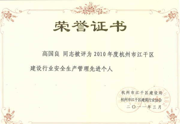 會議旨在總結經驗,表彰先進,現場宣讀了一批在2010年為江干區經濟發展做出突出貢獻的建筑企業和個人名單,并頒發了獎牌和證書。其中,公司被評為“2010年度杭州市江干區城市園林綠化優秀企業”,成為上榜的七家企業之一;公司工程總監、市政分公司副總經理高國良被評為“2010年度杭州市江干區建筑行業安全生產管理先進個人”。