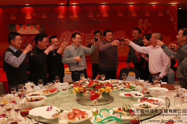 表彰儀式結束后,董事長吳光洪發表了新年致詞。吳董首先對各位領導和嘉賓的到來表示了熱烈歡迎;然后與大家共同回望了企業2011年所取得的成就,并對2012年的發展進行了規劃和展望,他感謝大家對杭州園林一路的支持與關注,希望未來仍能與大家一起攜手前行;最后,吳董舉起手中的酒杯,與大家一起為新的一年干杯,并宣布晚宴正式開始。