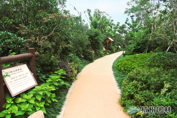 五千年的中國歷史文化,恢宏浩瀚,為園林造景提供了取之不竭的素材;園林景觀,也因為傳承了深厚的文化底蘊而散發(fā)出獨特的藝術魅力。作為一個旅游度假項目,對園林景觀的要求,不僅僅只是精致大氣、風韻天成的美景,更需要有深厚的文化底蘊,彰顯獨一無二的中國元素。為此,在2號樓大廳門前,用植物造景再現(xiàn)代表中國書法中筆畫大體的“永”字八法,彰顯中國書法的魅力;在泡池的建造上,運用老石碾、壓門石、老磨盤等老石材,打造出懷舊氣息濃郁的鄉(xiāng)土風情。
