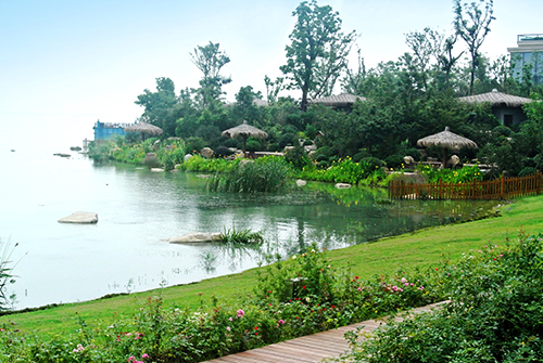 該項目將“以人為本,尊重自然”貫穿于設計到施工的各個環節,為了最大限度地保護太湖水域環境,各個施工環節中,因地制宜,因材施用,在駁岸處理中,通過草坪入水、水生植物種植、景石運用等方法,在充分保護原有湖岸的基礎上,加強對湖水水質的凈化,營造出生態、自然的湖岸景觀,成為項目中的一景。此外,種植的植物,大量選用當地鄉土樹種,既營造出濃郁的景觀特色,又有利于提高植物的成活率,減少后期的養護費用,有效節約了工程成本。