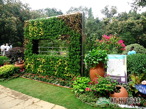 走進畫境園,只見主入口左側種植著兩株一高一矮的厚皮香樹,郭昌如笑著說,“這兩棵厚皮香寓意的是兩個萬分自豪的森林衛士——熊大和熊二,你看,熊二還滿臉熱情地向游人不停地招手示意呢。”主入口右側是一面立體綠植墻,所用的植物主要為黃金絡石、金寶石冬青、小葉梔子花、金邊黃楊等。“立體綠植墻是立體綠化的主要形式,畫境?青山湖花園中心推出的這款立體綠植墻產品,可以根據客戶需要,結合氣候、溫度、濕度、色彩等綜合條件,選配四季長綠或色彩豐富的植物,隨時在人們想要的地方構建出一個貼近自然又超脫自然的生活環境,可謂是簡單又方便?!惫缃榻B道。立體綠墻的兩側,隨意地散落著一些紅陶罐,與金寶石冬青、龜甲冬青等精品球形植物,三角梅、月季、常春花、雞冠花等花卉,紫葉狼尾草、晨光芒、矮蒲葦等觀賞草混搭,營造出一種溫暖、和煦的庭院景觀。“如果把綠植墻看成是城市的建筑,此景則喻意美麗杭城的繁華一角。”郭昌如補充說。綠植墻的中間還別出心裁地設置了一扇窗戶,透過它,園內的美景已隱約可見。