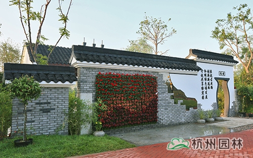 入口一組大氣的景墻組合先聲奪人,靈感來源是浙江絲布發展中古染坊的形態與內涵,左側的一堵長景墻,本身平淡無奇,但配上了那一組晾曬絲布藝術,頓時給人眼前一亮的感覺;右側的這面景墻則為傳統古染的縮影,輔以花卉點綴,正是歷史與花藝的完美融合;正中的景墻則極富山水意境,借景入畫,山石,松柏,渾然一體。