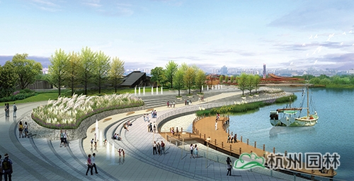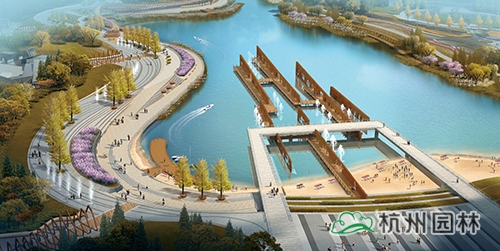 水岸廣場(chǎng):臺(tái)地張弛有度,將臺(tái)階、坡道、草坪、木平臺(tái)、廣場(chǎng)組成豐富的濱水空間,流線(xiàn)型的岸線(xiàn)貫穿整個(gè)臺(tái)地,形成一條觀(guān)光濱水走廊,結(jié)合濱水岸線(xiàn)設(shè)置游船碼頭、親水平臺(tái),形成極具特色的水岸廣場(chǎng)。