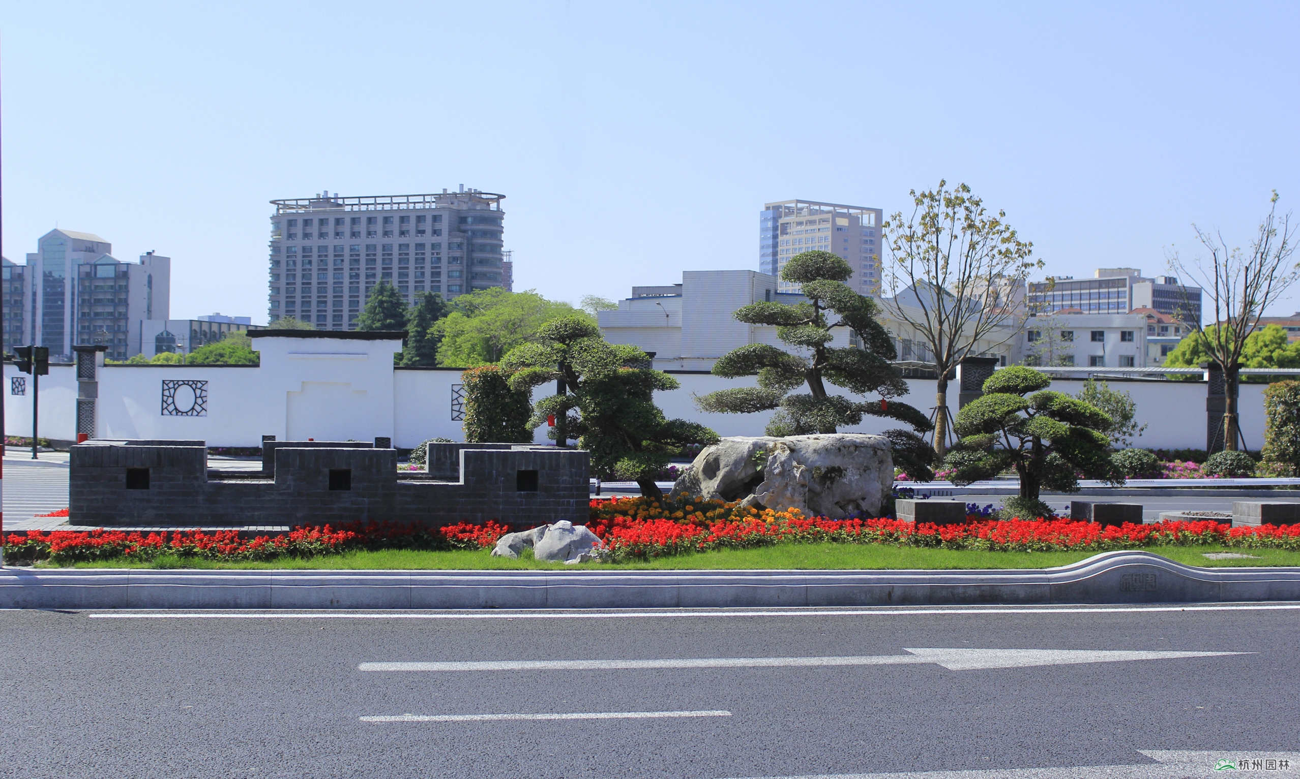 作為項目的施工方,為保證精品工程的創建,杭州園林在組織一支優秀施工團隊的同時,大膽嘗試運營新的組織架構,采用工程設計部+技術服務部的模式。其中,工程設計部協助項目經理與施工員,根據現場進行深化、優化設計,形成可操作、可落地的施工圖設計;技術服務部則由常務副總裁、景觀效果總監李壽仁親自帶領一支經驗豐富的專業技術隊伍,為項目建設提供景觀營造專業的現場技術服務與支撐。在造園手法上打破常規,把群落組合與盆景化手法運用于城市道路中央分隔帶,成為全國范圍內的一次創新之舉。