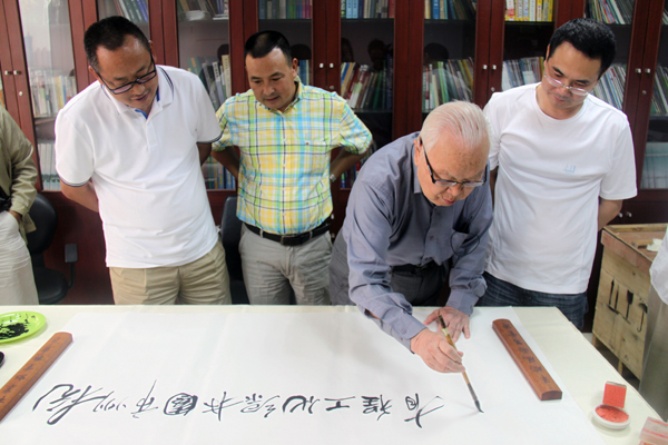 孫老不僅是一位園林規(guī)劃設(shè)計專家,同時也是一位書畫名家,他曾師從徐悲鴻、孫多慈教授學(xué)畫,具有很高的藝術(shù)修養(yǎng)。在我們的邀請下,孫老欣然提筆,寫下了“杭州市園林綠化工程有限公司”、“易大景觀”等公司名稱,以及“天然圖畫”、“造化為師”等題詞,以精準的語言凝煉了他對園林行業(yè)的看法,寥寥數(shù)語中,讓我們深受啟發(fā)。行云流水的筆法、流暢飽滿的線條,每一幅題字都一氣呵成,每一幅題字都是一幅藝術(shù)畫。每幅題字寫完,大家都會報以熱烈的掌聲,孫老對園林的深刻見解及深厚的書法功底令我們深深折服。