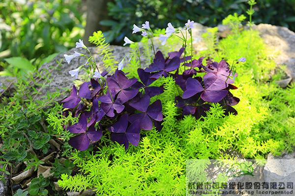 葉片紫紅色、花朵淡粉色的紫葉酢漿草,是萬綠叢中一抹亮麗的紫。