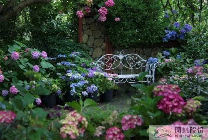 ▲園林股份自主選育的‘青山’系列繡球在畫境·青山湖花園中心室外景觀展示區中的應用