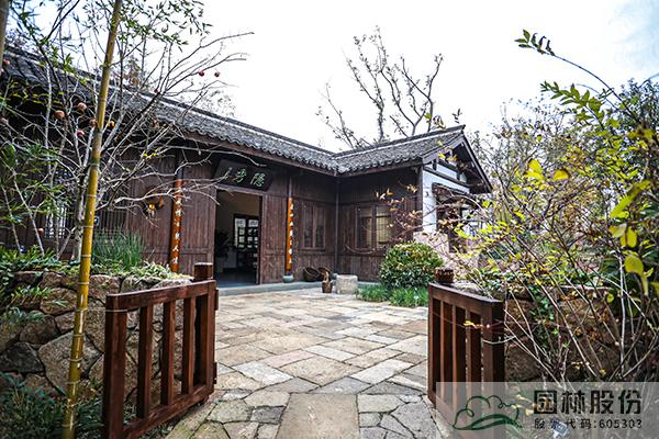 竹隱:主入口采用江南典型的錯落雙面門樓造型,木結構古雅清新,上書“家在錢塘”點明主題。正前方主題照壁形成障景,展現杭州園設計靈感與造園精神。