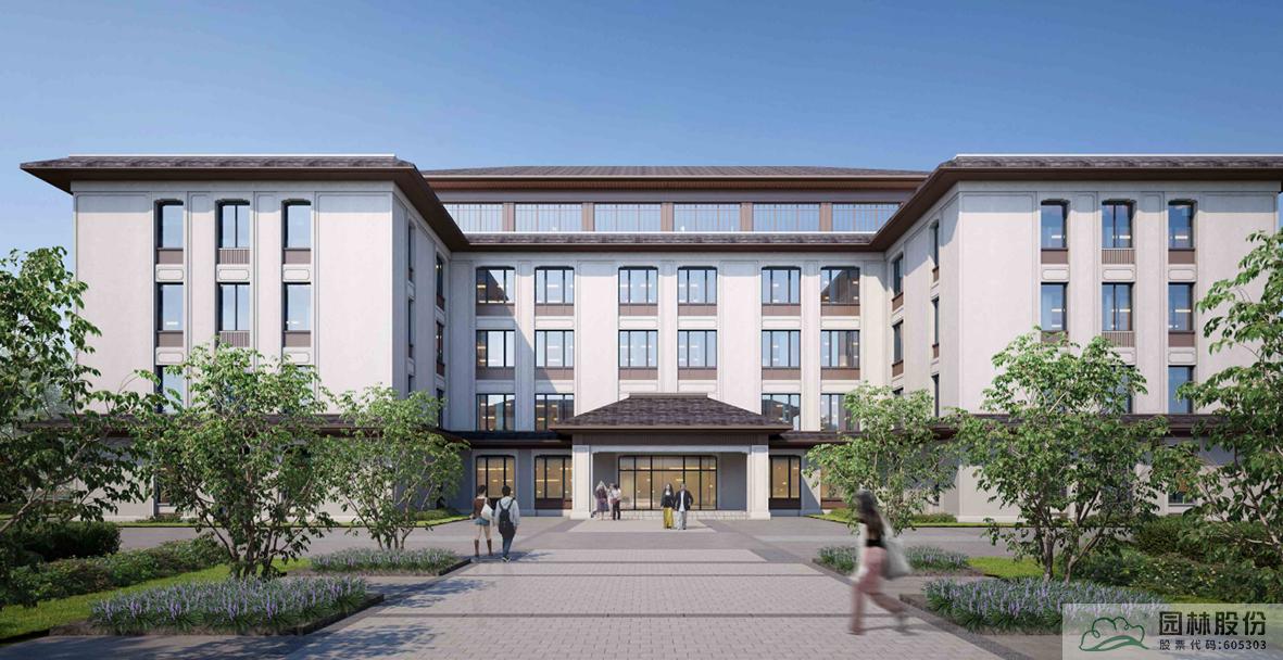 建筑風(fēng)格以新中式為主,在與朔西湖大景區(qū)的風(fēng)格相協(xié)調(diào)下,同時兼顧了使用功能。東西向的校園主軸線,從主入口廣場起,經(jīng)整齊的樹陣、升旗臺、至綜合教學(xué)樓與綜合服務(wù)中心圍合的中心廣場,并向東延伸到宿舍區(qū),是校園中最主要的視廊,大氣、莊重。