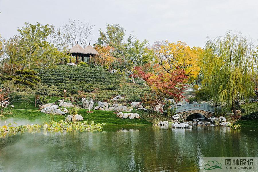 契合展區主題的樾香亭臨湖而立,雙坡屋面,八柱敞亭,柱子上書五言聯“魚樂人亦樂,泉清心共清”,盡顯悠閑舒適的情趣。在亭內憑欄而坐,側耳聽風雨,迎風嗅花香。抬頭遠望,荷葉亭亭的水面上,有魚兒在水中嬉戲;曲折的長橋上,游人在漫步觀景;水岸邊,銀杏、三角楓、烏桕等色彩繽紛,編織出一幅深秋的美麗畫卷。