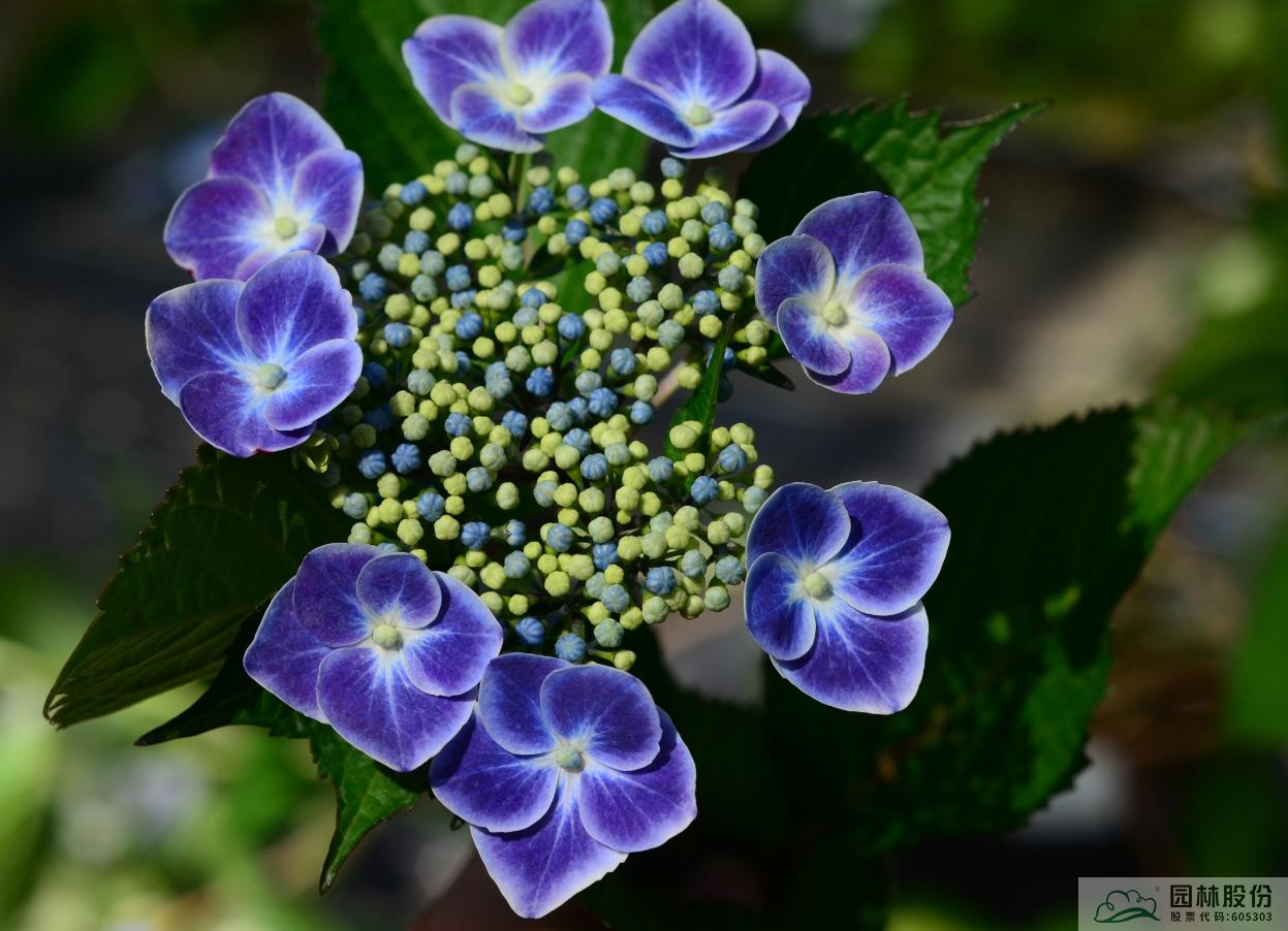 大葉繡球‘夢幻星空’:傘房狀聚傘花序盤狀,高度2~4cm,直徑10~12cm,上海及杭州5月中下旬開花,可延續至6月下旬;可孕花花瓣藍色;不孕花萼片先端白色至淺藍色中部藍色至紫色基部白色;花色夢幻,花型飄逸,適合家庭園藝和工程。