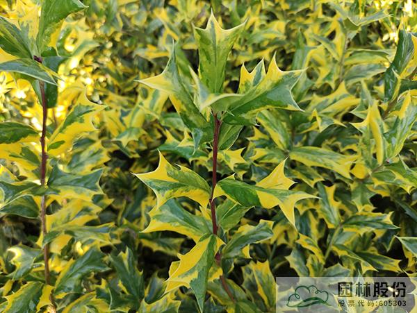 花葉枸骨Ilex cornuta 'O Spring':它的母本是我國最為常見的的枸骨,經常在溝壑、丘陵和山路旁發現其存在。由俄克拉荷馬州的一名苗圃工人Otto Spring發現的變異。常綠灌木或小喬木,屬于雄性植株。葉厚革質,有光澤,葉形呈四角狀長圓形,葉緣常反曲,在春季,葉緣呈現黃油色調,到了秋冬季則會變成金黃色,莖稈也會變成紫色。適合種植在庭院、公園、街道等地方,可以作為綠籬植物使用,也可以修剪成小樹的形狀。對土壤適應性較強,幾乎可以在任何土壤中生長,而且具有耐干旱和高溫的特性。因此,它是一種簡單耐用的冬青品種。