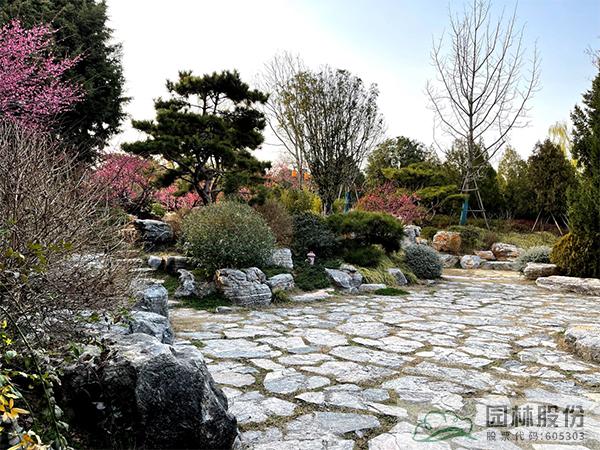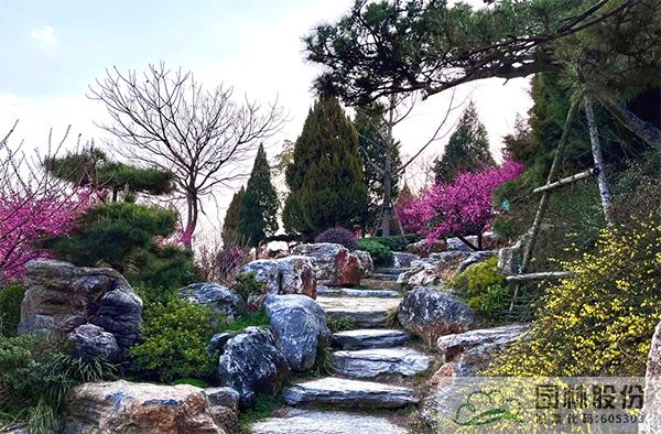運用山石點綴園林空間,比如:路石、駁岸、擋土墻、石磯、踏步、護坡、花壇,既造景又具實用功能;石材的機理及質感在環境中可起到點晴作用,使園林空間層次感及深度得以加強。