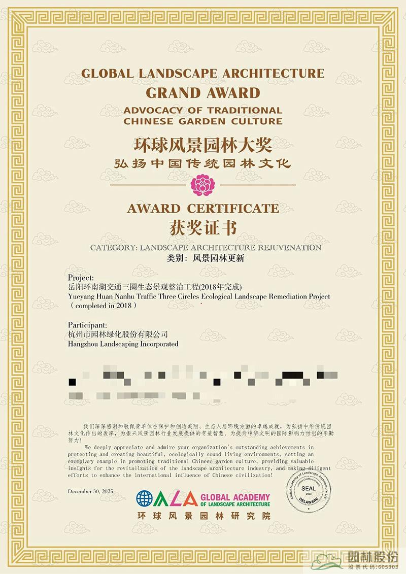 近日,環球風景園林研究院公布 “環球風景園林大獎” 評選結果,杭州市園林綠化股份有限公司承建的岳陽環南湖交通三圈生態景觀整治工程、畫境園兩大精品項目,憑借卓越的設計營造水平與生態文化價值,雙雙斬獲風景園林更新綜合類大獎,以硬核實力彰顯中國園林企業的專業水準與文化擔當!